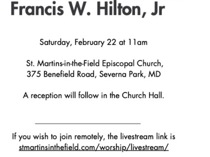 Frank's inurnment will be at the columbarium on Hospital Point on Monday, February 24 at 11:00 a.m. You are all also welcome to come to that as well.