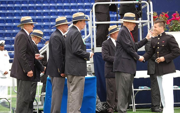 For all you 63ers out there--I attended the graduation ceremony for the Class of 2013 on Friday. As you know, we had 12 classmates handing out bars and a memento to the graduates immediately after the shook the President's hand and received their diploma--one at a time up on the stage. I am sure Shipmate will cover the affair so I only want to convey that our classmates involved did us proud. They were dressed all the same and shared duties will each and every graduate. The class and these individuals were listed in the program with an explanation of ALITC idea and the President even mentioned the Class of 63 in his remarks. He actually gave a nice speech--he sure can deliver a speech well, can't he? Anyway--I wanted you to know our reps did a wonderful job in the cold, rainy weather in front of 10,000 or so folks. By the way--there were 256 marines in a class of over 1000 graduating. Our CAE must be working!!