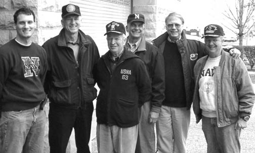Every other year when Navy plays Notre Dame in South Bend, a number of us meet to witness Navy's loss. Here is a snapshot from our last get together (in November 2001), with our part of the Navy rooting section consisting of Dr. Jason Florimonte (Jerry Jordan's son-in-law), Mike Obsitnik, Phil Gubbins, Gene Dehnert, yours truly, and Ralph Kimberlin.