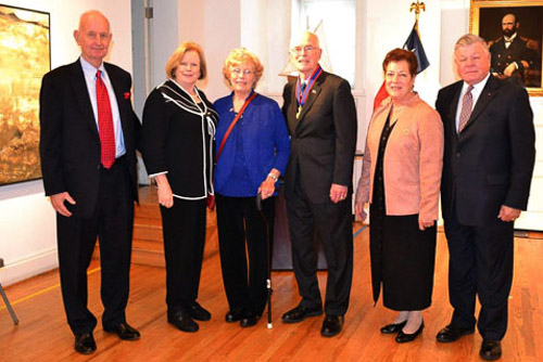 Here are some pictures of our classmate RADM Joe Strasser and his wife Barbara at the Chilean embassy in Washington, DC, on October 19th when Joe was presented with the Medal of the Naval Order of Merit, Officer's Degree. In presenting Joe with this prestigious award, Captain Marcelo Gomez, the Chilean naval attaché, cited Joe's many contributions to the Chilean Navy when he was the president of the Naval War College in Newport and the strong ties and friendships that he forged between the two navies beginning in 1962 when Joe made an exchange cruise with the Chilean Navy as a midshipman first class. The Chilean ambassador hung the medal around Joe's neck and there was great applause from all assembled. Joe then expressed his thanks in Spanish to the delight of all.