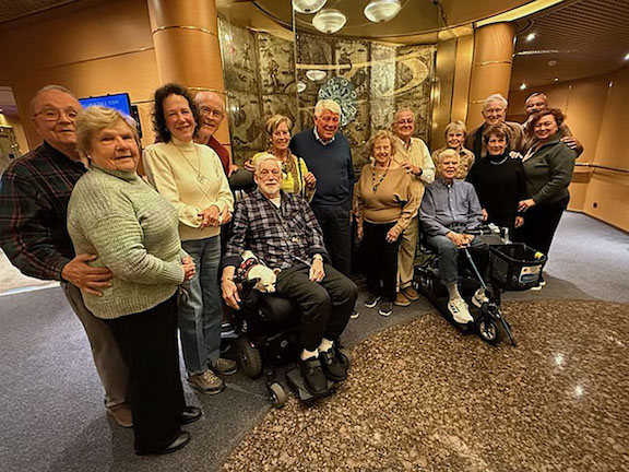 Our intrepid cruisers were seven 4th Companymates, along with family. Appearing in this photo (L-R) are Harry and Doris Salmon, Pat and Maureen Wright, Dick Wyttenbach-Santos (with his service dog, Todo), Craig and Gail Barton, Lou and Jo Ann Simpleman, Blackie and Bonnie Blackledge, Tom and Claire Meyer, and Dick's adopted Guamanian family of Laurie and Joe Manubusan.
