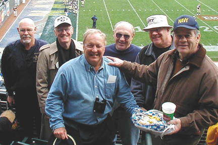 It was a great game and the party continued when we all returned from the stadium in Philadelphia. Search and rescue produced Jim Tolbert and John Castro for the post-game muster to celebrate another Navy victory. This snapshot shows (standing) John Conroy, John Newsom, Dave Honhart, and Fred Storz; in the front row are Jim Tolbert and John Castro.