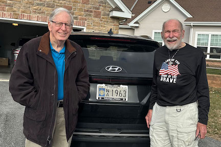 I stopped by to see our Frederick, MD, neighbor Jim Koehn and welcome him and Judy to town. They've been here for a few months, but we had been away in Maine until recently. The Koehns came from Nevada to be closer to family and are almost all unpacked. I complimented them on their N-Star Blue and Gold banner waving proudly. I took the opportunity to have Judy photograph us by my long time USNA-1963 vanity license plate. Many years ago, when the Alumni Association first offered them, Carol waited in line and insisted on this number. Their mindset resisted, insisting they would only issue in numerical sequence. Once aware of the standoff, I quickly had members of '60, '64 and '66 show up with similar requests. Surprisingly, they agreed to issue out of sequence. A rare condescension for our "beloved" organization.