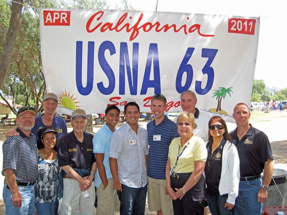 A number of San Diego classmates gathered at Coronado's Concert-In-The-Park at the end of July to enjoy the balmy weather and lively music. For a special treat we were joined by some Class of 2013 parents and midshipmen. Gathered under the Class of '63 banner were Karl and Marirose Kozak, Dave and Patti Meyers, Max and Edith Ricketts, Donna Kaup, Jay Roberts, Chuck Stone, Vern VonSydow, Lee and Sue Cargill, Charles and Nancy Helsper, Dave and Lana Moore, and me. A great time was had by all as we particularly enjoyed the enthusiasm of the young Mids who have yet to hear all our old sea stories! While we were there, the widow of member of the Class of 1994, Mary Ellen Bancroft, came up to me requesting a "1963" hat -- to mark her birth date! I gave her one of my spares.  Phillip's second report was about a San Diego picnic for members of the Class of 2013.