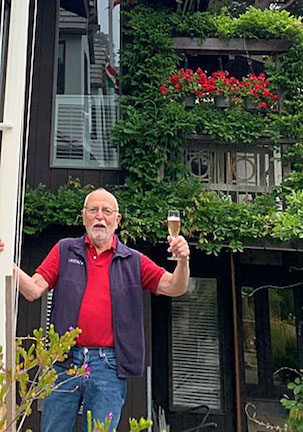 John Peterson celebrates his new flagpole, a former sailboat mast |
