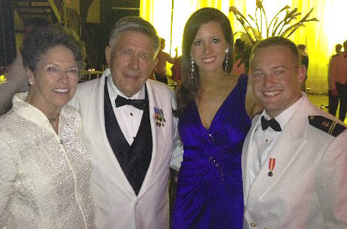 We had a special day on July 4 aboard MIDWAY in San Diego. For some time now, I have contemplated passing my sword to a member of the Class of 2013. Well, it so happens that Midshipman 1/c Laura Curtis, the granddaughter of very long time Supply Corps friends, Joe and Janet Bartel, is now somewhere in the top 30 in the Class of 2013. These photos were taken aboard MIDWAY in front of the A4 memorializing our classmate Stan Smiley, who was KIA in Vietnam. Along with about ten other family members, our classmates Vern Von Sydow and Don Jacobs attended, as well as Laura Curtis' father, Capt. Adam Curtis, USN (Ret.) '85, a Navy Seal. A key part of this presentation was reciting the Laws of the Navy (upon which the Link in the Chain program is based).
